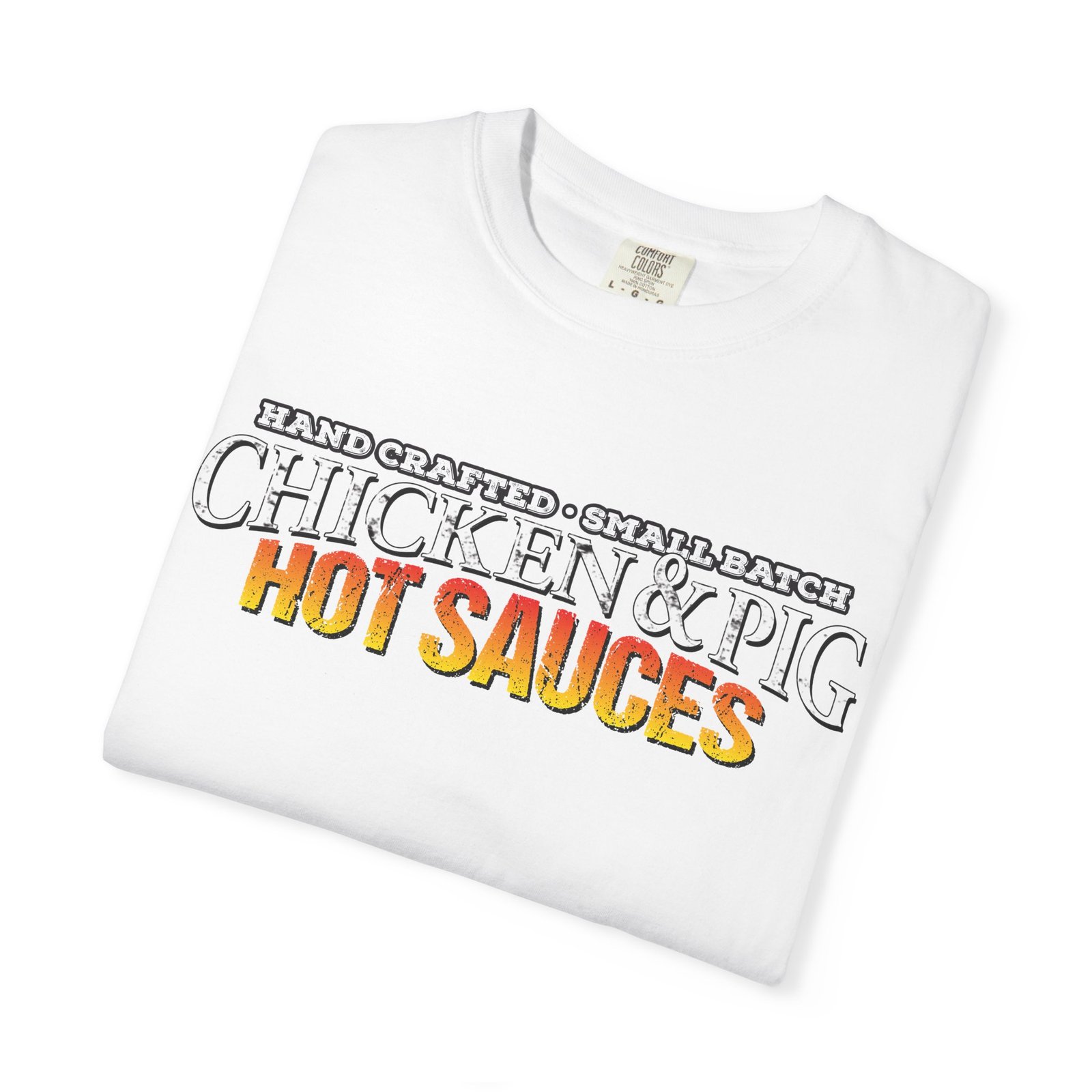 This relaxed, garment-dyed tee wears like something youāve had for years ā soft, a little lived-in, and quietly confident. The front graphic reads āHAND-CRAFTED ⢠SMALL BATCH CHICKEN & PIG HOT SAUCESā with a warm, smoky palette that hints at late-night backyard grills and small-batch kitchen experiments. Lightweight but substantial, the heavyweight cotton holds the printās texture while the garment-dye gives each shirt a subtle, vintage depth. Throw it on for a weekend cookout, a roadside food-festival shift, or when youāre bottling up your latest hot sauce batch and want something comfortable that still feels like part of the craft. The relaxed fit and durable double-needle stitching mean this tee will be the one you reach for again and again.